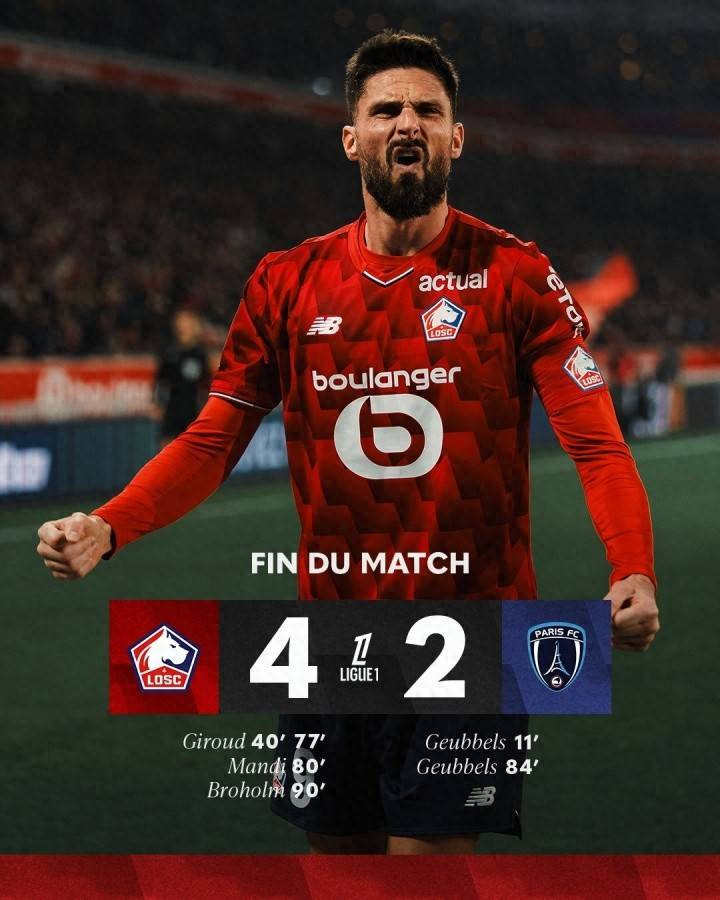 法甲第13轮,里尔主场4-2逆转巴黎FC,39岁的里尔中锋吉鲁本场比赛梅开二度,终结各项赛事9场进球荒。据OPTA统计,吉鲁也成为1947/1948赛季以来,法甲梅开二度年龄最大的球员。